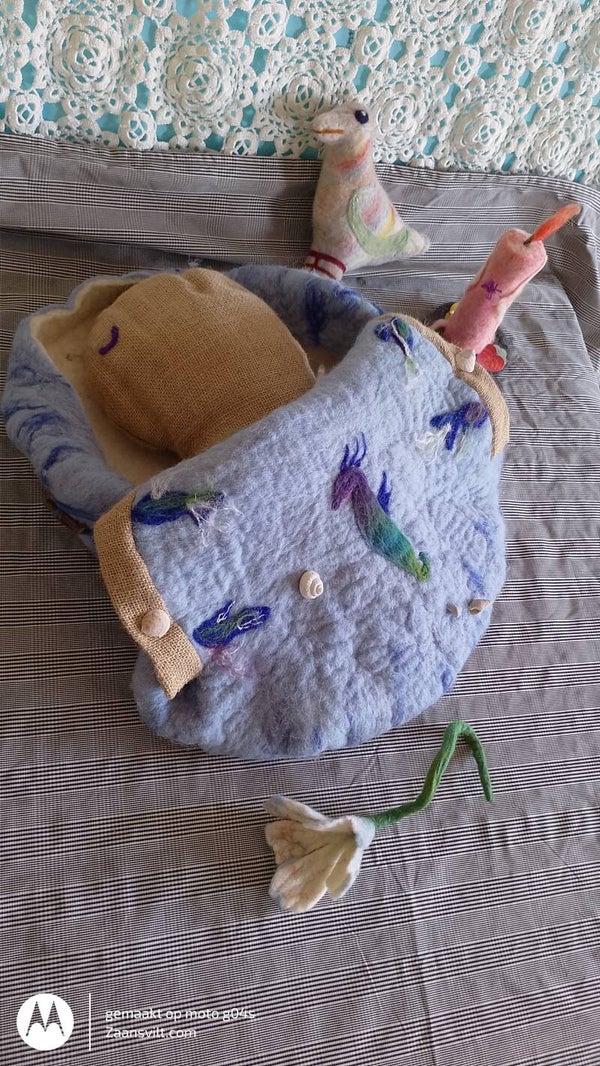 babywade in ronde vorm. Daarom ook ruimte om een knuffel erbij in te kunnen leggen. Bij de opbaring kun je ervoor kiezen de bovenkant van de wade elke dag iets meer op te halen maar kan ook geheel naar binnen geklapt worden. Af te sluiten met lus en takjes knopen aan de onderkant.